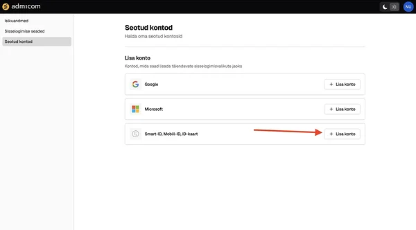 - Vajuta Smart-ID, Mobiil-ID või ID-kaart rea lõpus "Lisa konto" nupule ning järgi juhiseid.