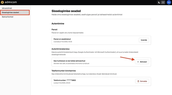 Avanenud vaatest tuleb vasakult valida "Sisselogimise seaded" ning sealt vaatest vajutada Aktiveeri nuppu autentimisrakenduse all.